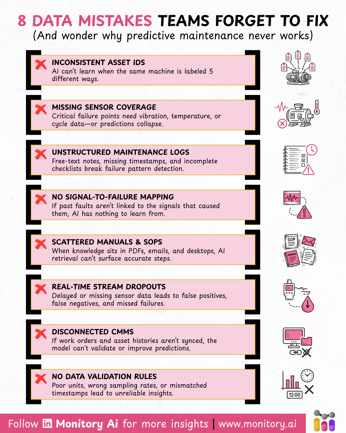 Most predictive maintenance programs fail not because of bad algorithms, but because of bad inputs. Here are the 8 data mistakes that derail AI-based maintenance: