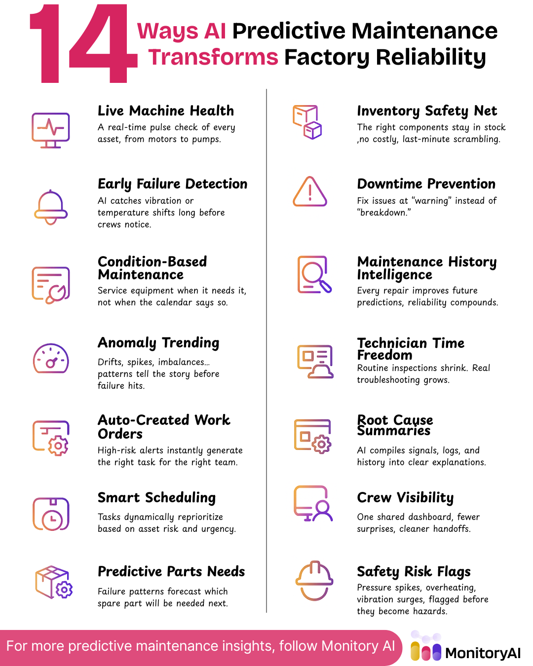 Now let’s flip the script. When your data pipeline is solid, predictive maintenance stops being a buzzword and becomes your factory’s superpower. Here are 14 ways predictive maintenance works when powered by AI: